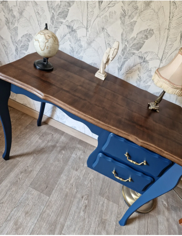 Un ancien bureau vintage de couleur bleue avec un plateau en bois. Ce bureau est très pratique grâce à ses deux tiroirs. Un meuble vintage remis au goût du jour avec beaucoup d'attention