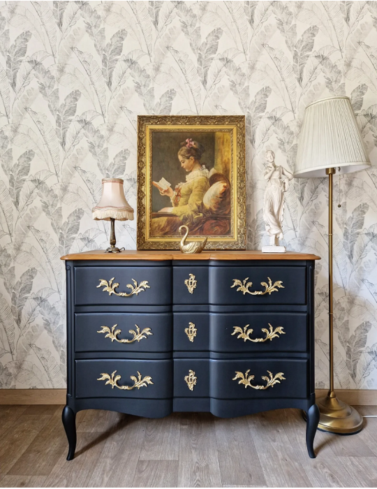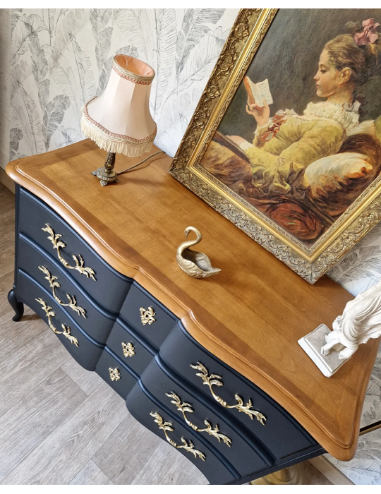 Une belle commode vintage de couleur noire avec un plateau en bois. Des poignées dorées d'origine. Un ancien meuble avec une forme galbée qui trouvera parfaitement sa place dans votre intérieur