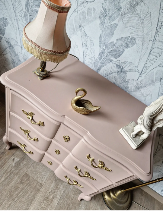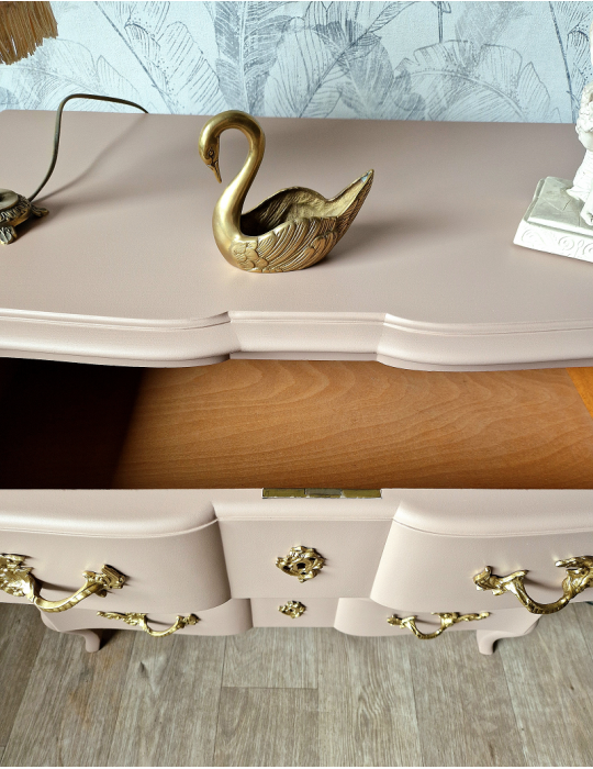Une belle commode customisée de couleur rose fanée. Mignone et chic grâce à ses formes galbées Des poignées originales dorées qui rapporte une touche vintage. Ce meuble trouvera facilement sa place dans votre intérieur