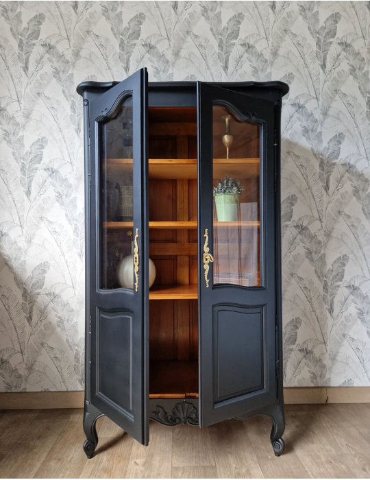 Une belle vitrine de couleur noire. Une sublime couleur profonde qui donne beaucoup de caractères au meuble. Cette vitrine pourrait servir de vaisselier ou bien de bibliothèque. L'intérieur en bois composé de 3 étagères. Très pratique pour présenter vos beaux objets de décoration