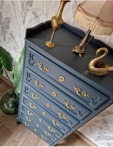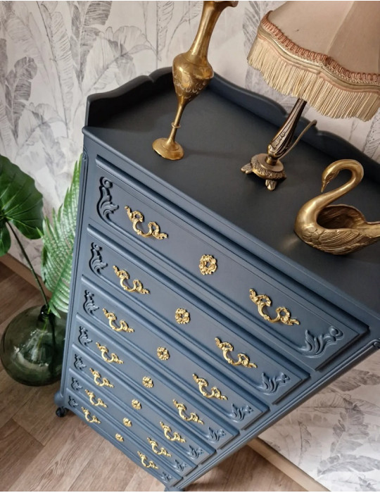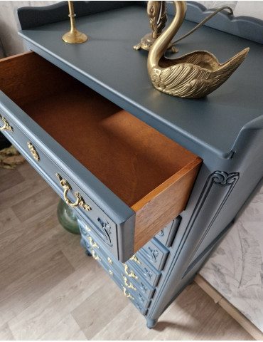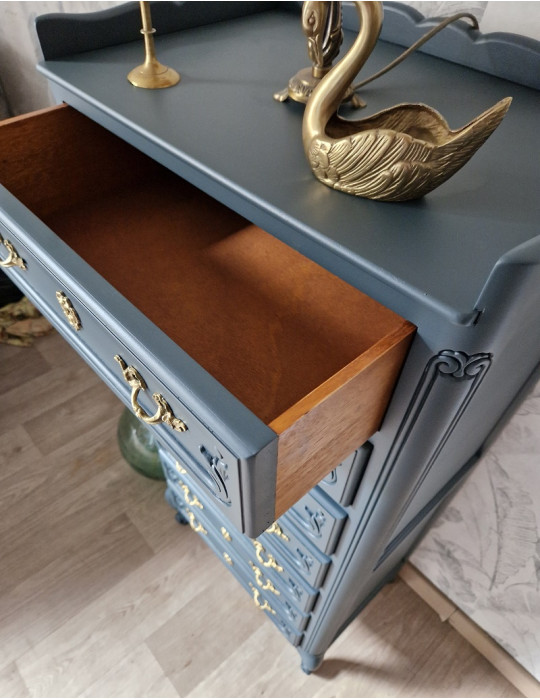 Un très beau semainier vintage à 7 tiroirs de couleur bleu gris. Une sublime couleur qui va à merveille avec le style du meuble. Ce meuble est très pratique grâce à ses nombreux rangement. Un style chic vintage qui rajoutera beaucoup de cash à votre intérieur