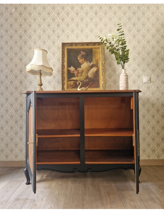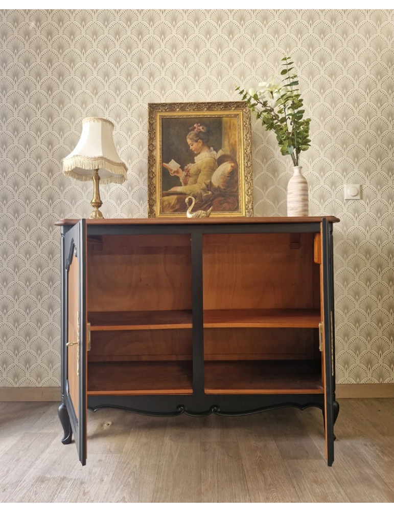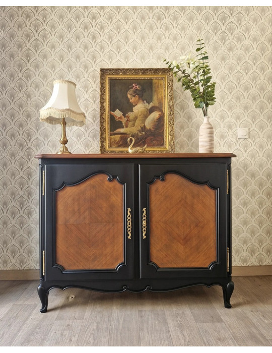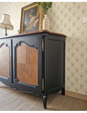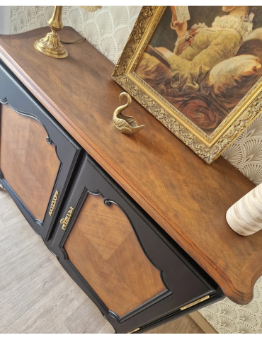 Un magnifique buffet vintage de couleur noire. Un plateau en bois vernis. Un très beau jeu de bois sur les portes. Ce meuble vintage est une pièce unique avec beaucoup de charme et d'élégance
