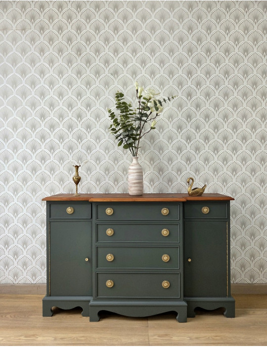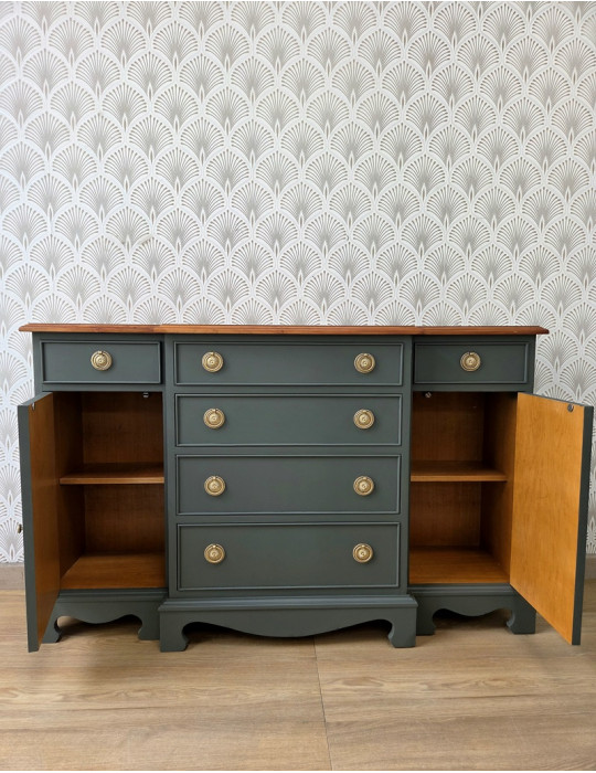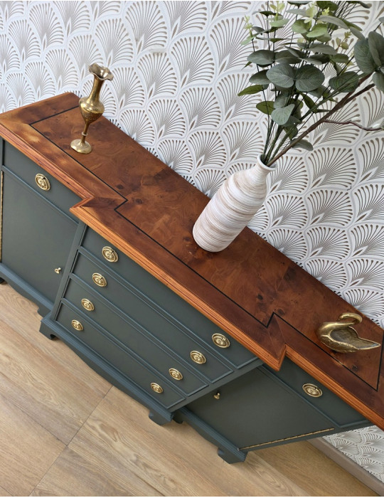 Un sublime meuble de rangement de couleur verte avec un plateau en bois. Une magnifique couleur et des poignées dorées. Très pratique grâce à ses nombreux rangements. Ce meuble pourra servir de meuble télé ou de meuble d'entrée