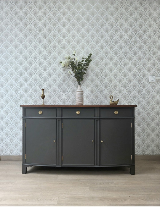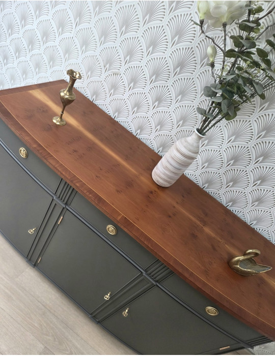 Un sublime buffet style anglais avec un plateau en bois. De couleur marron avec une légère nuance verte. Très pratique grâce à ses nombreux rangements. Un style épuré qui s'intègre facilement avec votre décoration