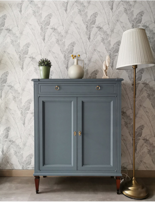 Un très beau buffet style anglais. De couleur bleu gris avec des pieds en bois brut de teinte acajou. Un meuble pratique qui vous offre un espace de rangement