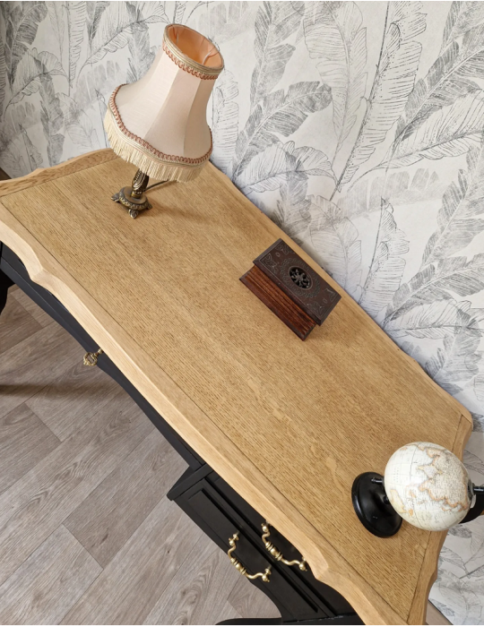 Un beau bureau vintage de couleur noire avec un plateau bois clair. Un meuble ancien très pratique grâce à ces nombreux tiroirs