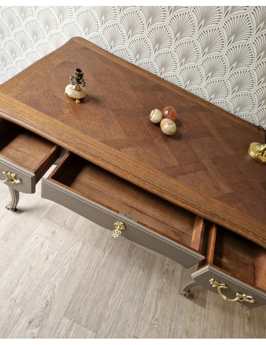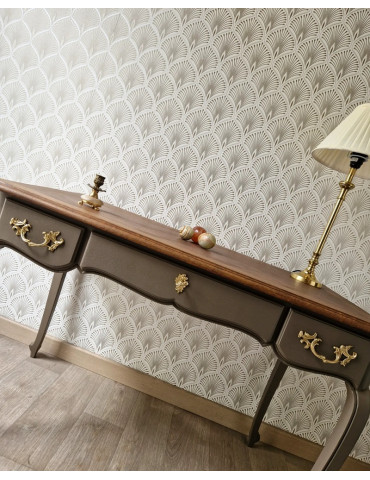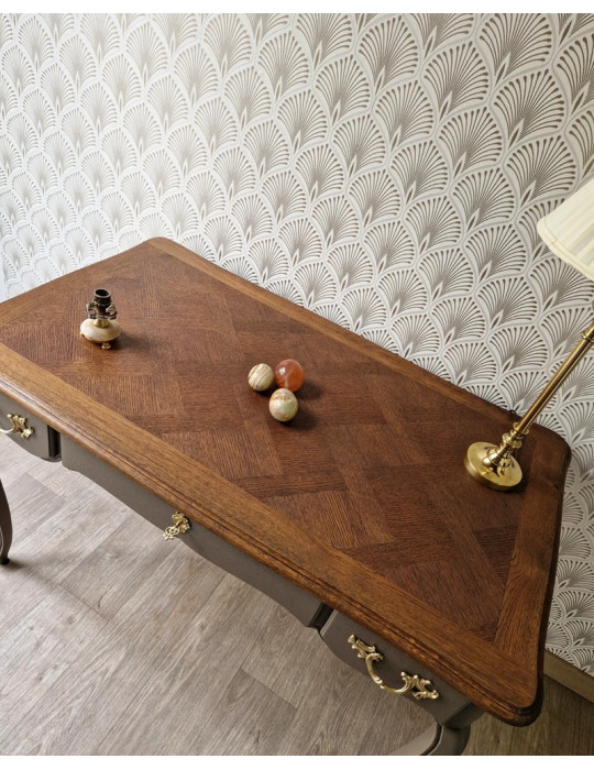 Un très beau bureau vintage de couleur marron avec un plateau en bois vernis. Trois tiroirs, très pratique pour ranger les petits objets. Il peut être installer au milieu de la pièce ou contre un mur. Très élégant, ce bureau rajoute beaucoup de charme à votre intérieur.