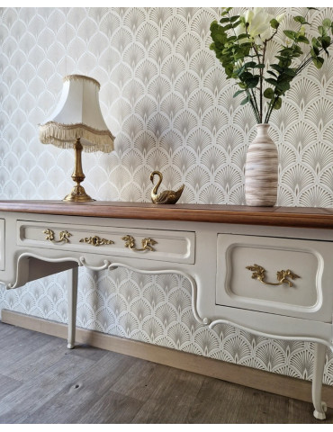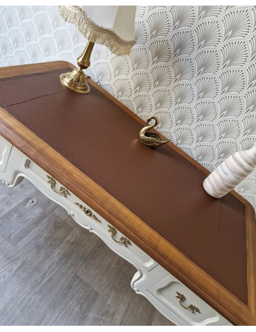 Un magnifique bureau de Versailles avec une sublime teinte en blanc cassé. Un plateau en bois et en cuir. Une élégante forme pour ce bureau qui rajoute beaucoup de charme à votre pièce