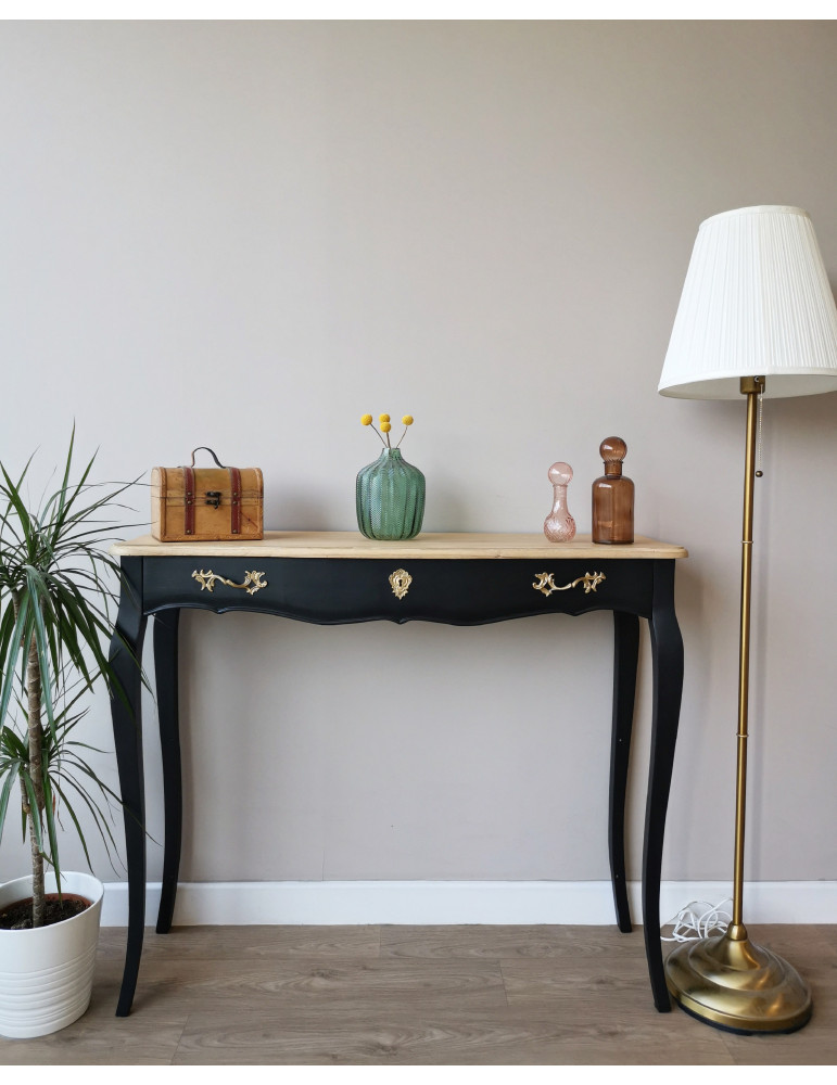 Une très élégante console de couleur noir avec un plateau en bois brut. Un style vintage chic. Elle rajoutera du cash à votre intérieur