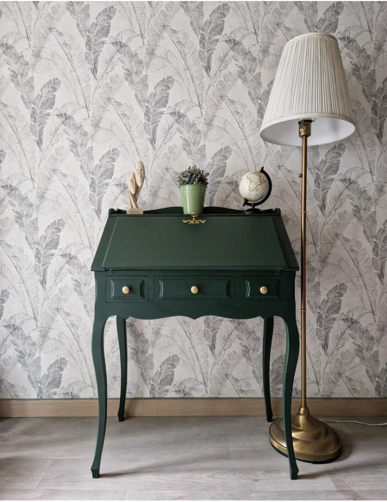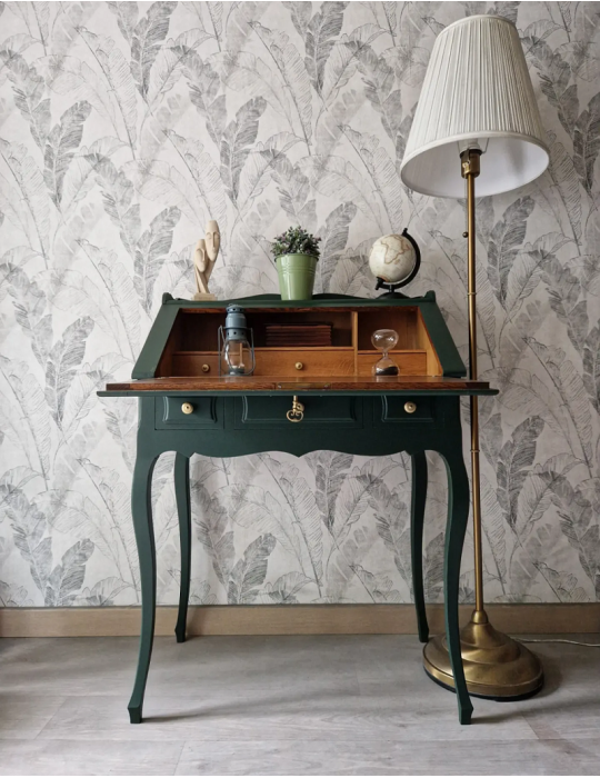 Un beau secrétaire vintage de couleur vert. Une belle couleur qui s'associe à merveille avec la forme du meuble. le tout pour un style élégant et chic. Très pratique et pourra faire office d'un coin de travail