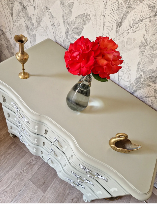 Une belle commode galbée style vintage. De couleur verte avec une nuance grise. Une couleur apaisante avec beaucoup de sérénité.