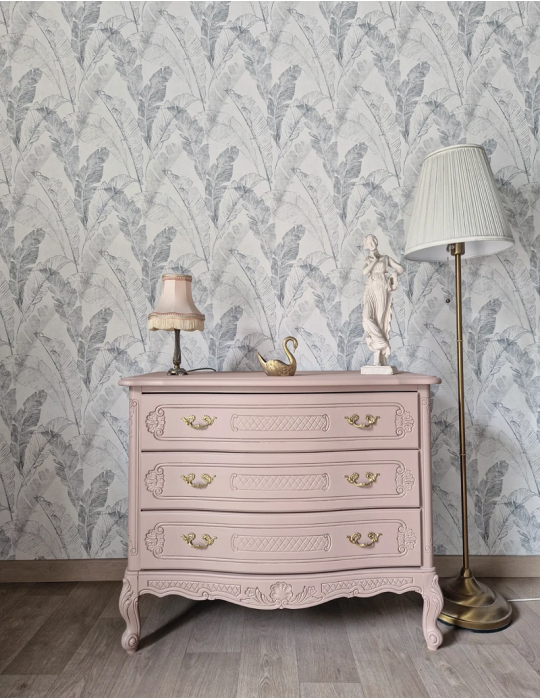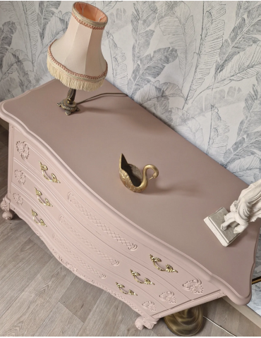 Une belle commode vintage avec une forme galbée. De couleur rose fané avec une touche dorée aux poignées. Une sublime couleur qui donne au meuble un aspect apaisant et moderne