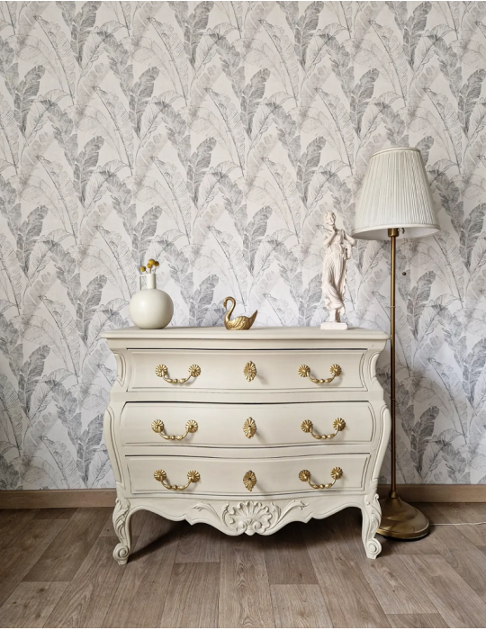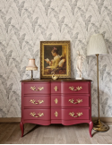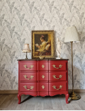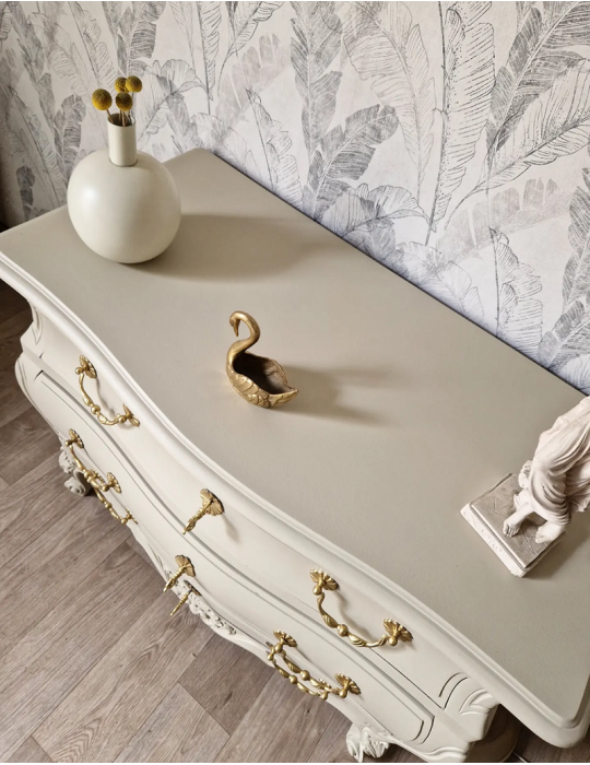 Une belle commode vintage avec un style galbée. Un meuble très rare. De couleur champagne avec des belles poignées dorées. Un style ancien très chic.