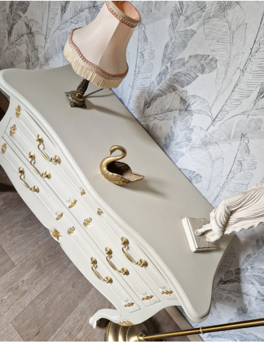 Une belle commode style vintage de couleur blanc champagne. Des moulures et des poignées dorées qui s'associent parfaitement avec la teinte de la commode. Un ancien meuble rare remis au goût du jour
