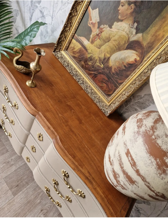 Une belle commode galbée de couleur beige. Un plateau en bois teinté en chêne dorée. Des belles poignées dorées pour donner un aspect vintage. Ce meuble relooké sublimera votre intérieur