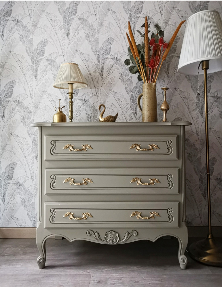 Une belle commode vintage avec un ton clair. De couleur beige légèrement doré et des petites nuances vertes