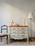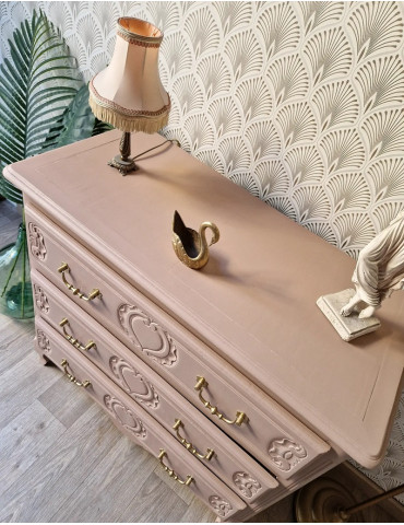 Une ancienne commode vintage de couleur rose fané. Des beaux motifs sur les tiroirs qui vont à merveille avec la couleur du meuble. Cette commode est très adaptée à la chambre de votre fille