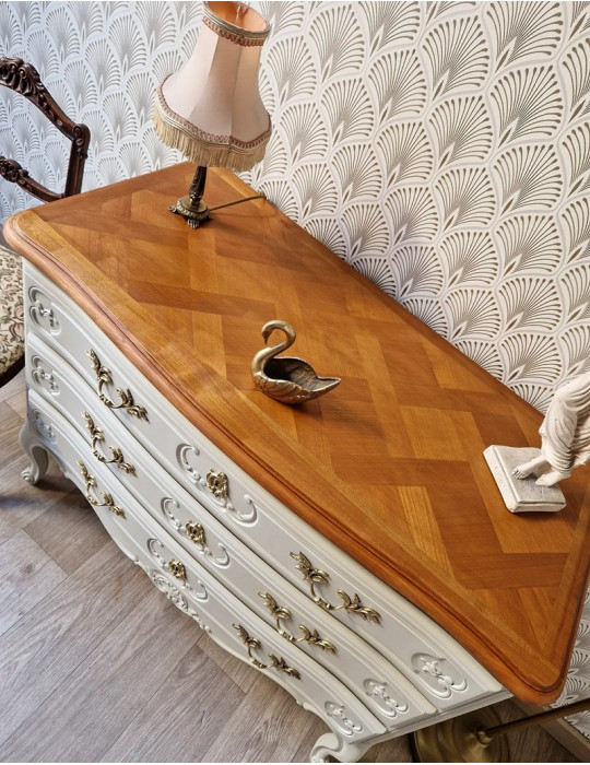 Une belle commode vintage de couleur blanc champagne. Une sublime couleur qui met en valeur les belles moulures du meuble et qui s'associe parfaitement au plateau en bois. c'est une commode très élégante qui sublimera votre intérieur