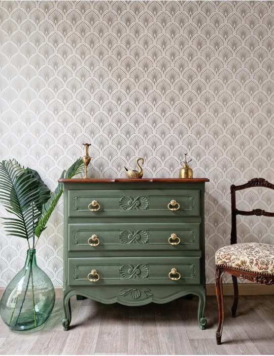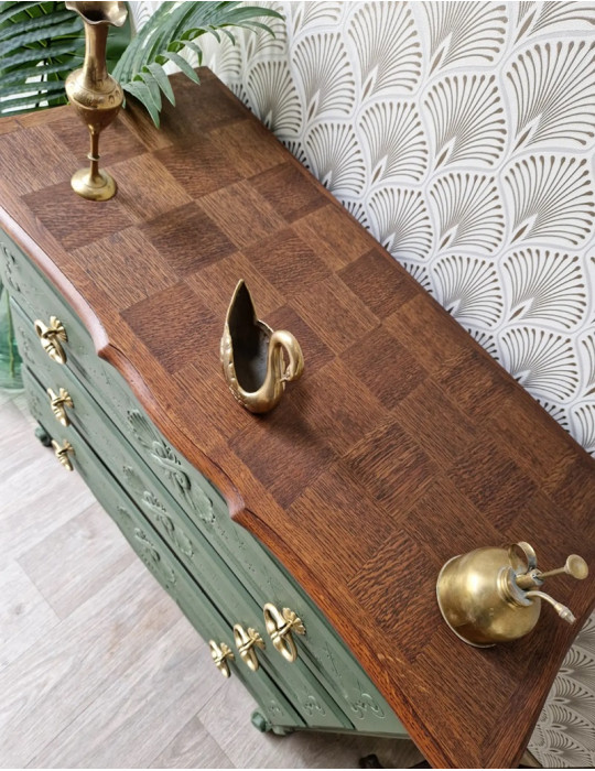 Pour les amoureux du style ancien, cette commode est pour vous. Une sublime couleur verte qui met en valeur les beaux motifs. Un plateau damier qui vient accentuer le style vintage de ce meuble