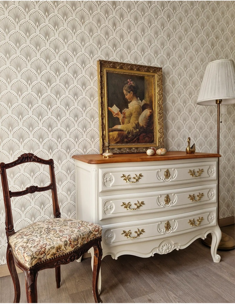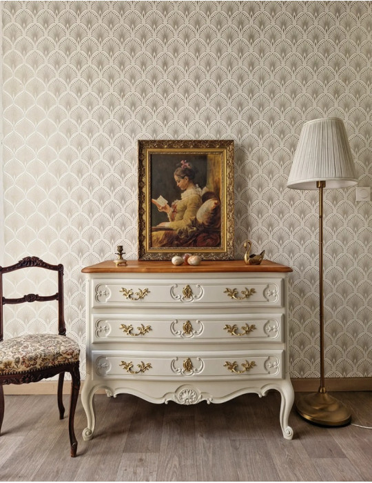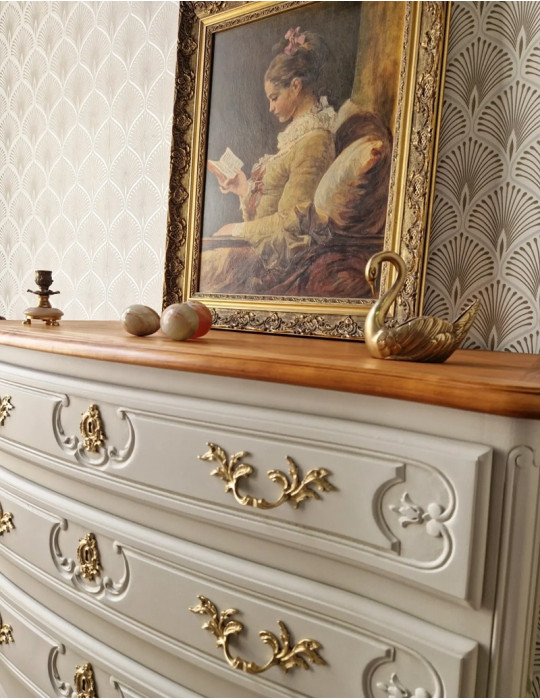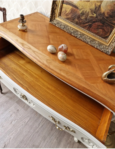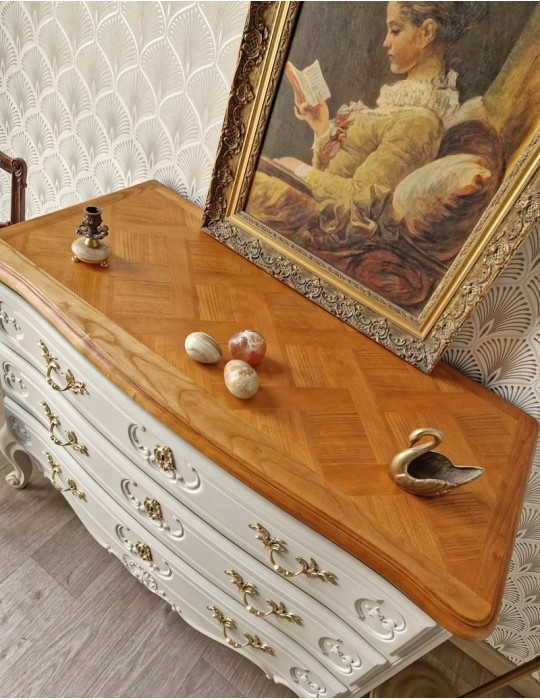 Une magnifique commode avec des belles moulures. Elle est de toute élégance, ce magnifique meuble sublimera votre intérieur. Une couleur blanc cassé avec une légère nuance crème. Un très beau plateau en bois avec une légère teinte dorée.