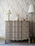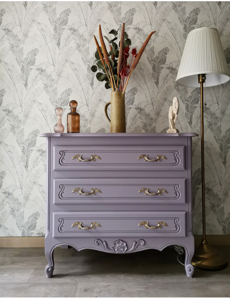 Une belle commode vintage de couleur lavande. Grâce à cette sublime teinte, mettez une ambiance printanière dans votre intérieur. Une dualité entre le chic et la nature