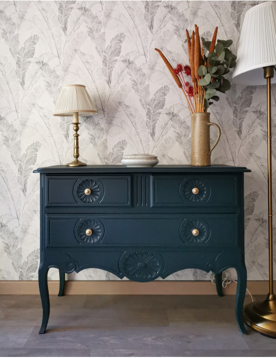Une belle commode vintage. Un style antique remis au goût du jour grâce à une belle couleur bleu vert et des poignées dorées. Ce meuble rajoutera du cash à votre intérieur