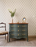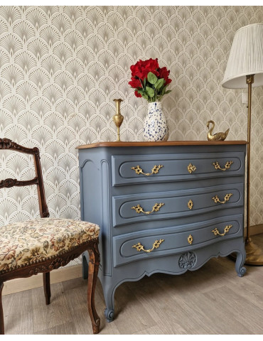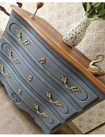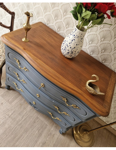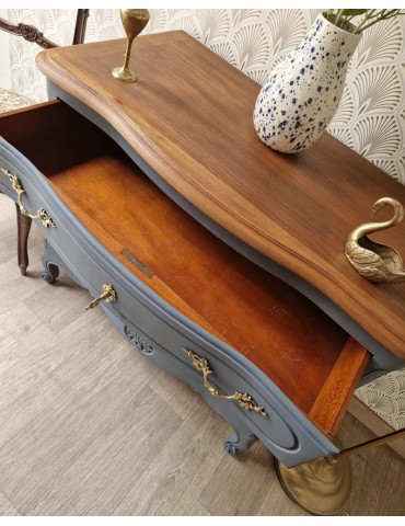 Une belle commode vintage galbée avec un plateau en bois. Une sublime couleur bleue grise avec une légère nuance violette. Des poignées d'origine dorées. Ce charmant sublimera votre intérieur