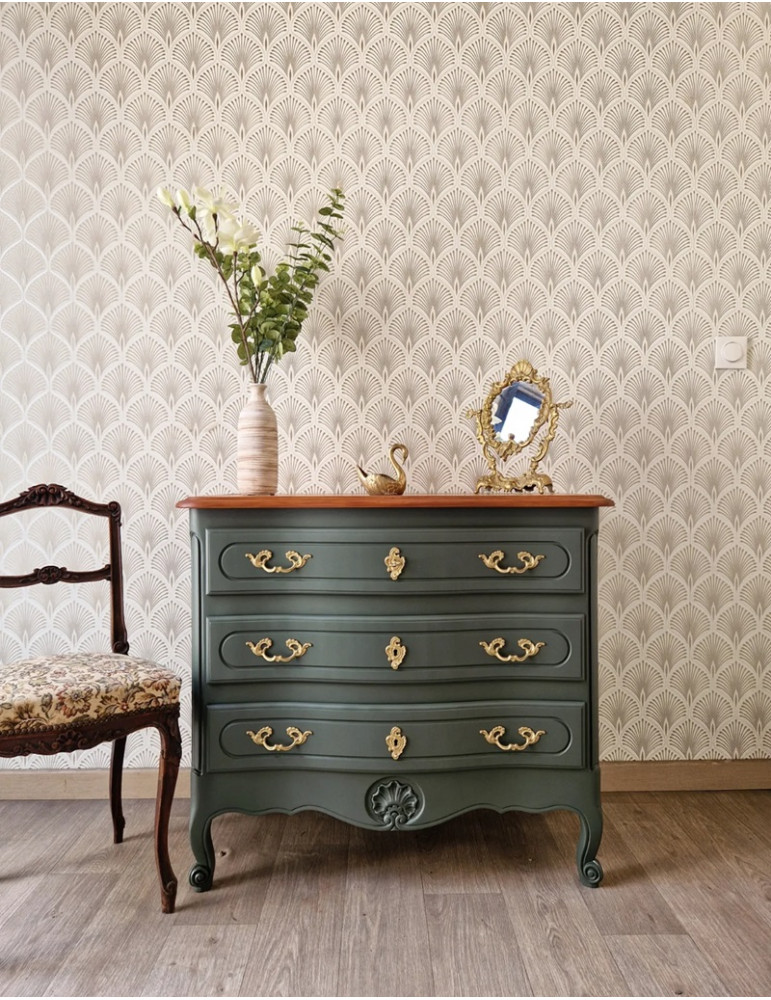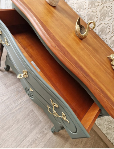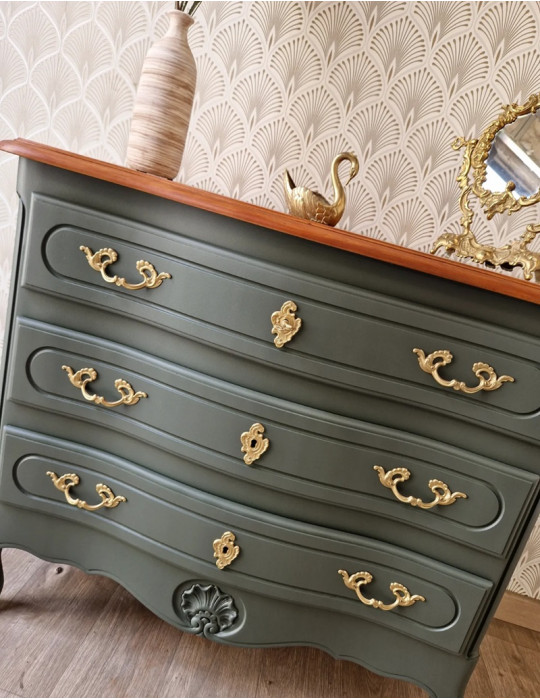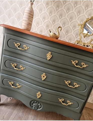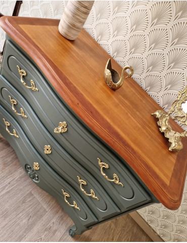 Une sublime commode galbée de couleur verte. Un plateau en bois vernis. Un meuble vintage chic avec beaucoup de charme qui sublimera votre intérieur