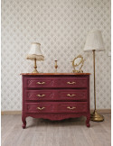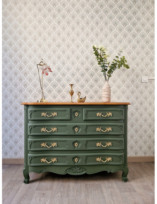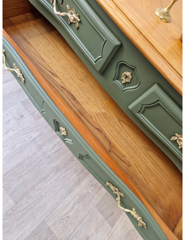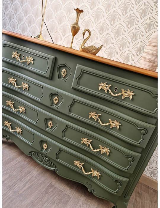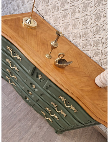 une sublime commode galbée à 5 tiroirs. Une magnifique couleur vert olive qui s'associe parfaitement avec son plateau en bois clair. Beaucoup de charme pour ce meuble qui sublimera votre intérieur