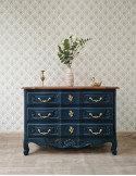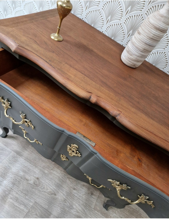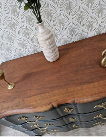 Une sublime commode de couleur verte avec des nuances grises. Le plateau de la commode en bois s'associe à merveille avec cette couleur. Un charmant meuble qui vous offrira une ambiance chaleureuse à votre intérieur