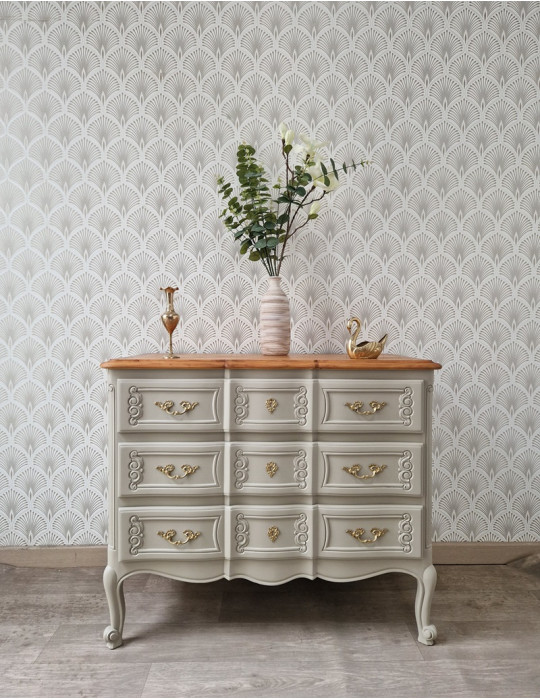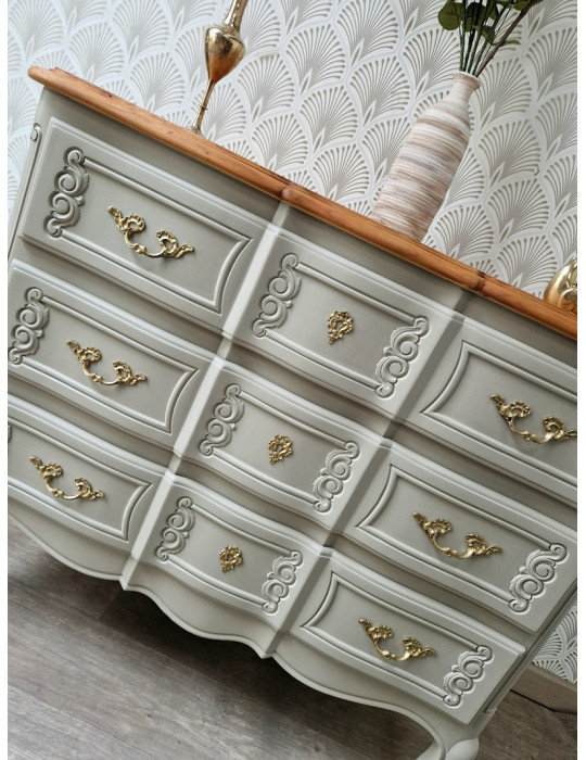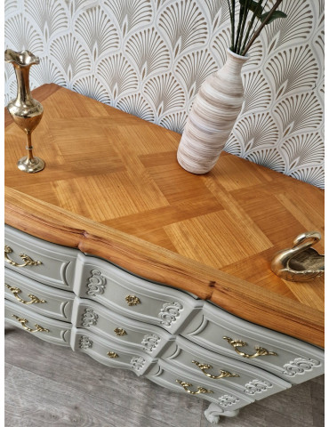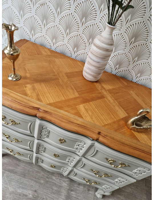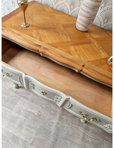 Une sublime commode de couleur beige claire avec un plateau en bois vernis. Des belles moulures qui rajoutent beaucoup de charme à ce meuble. Cette commode se place facilement dans une entrée ou dans une chambre