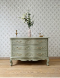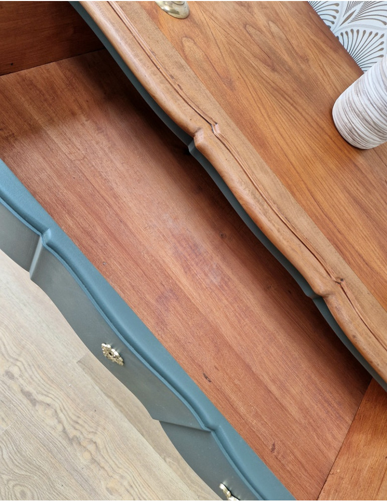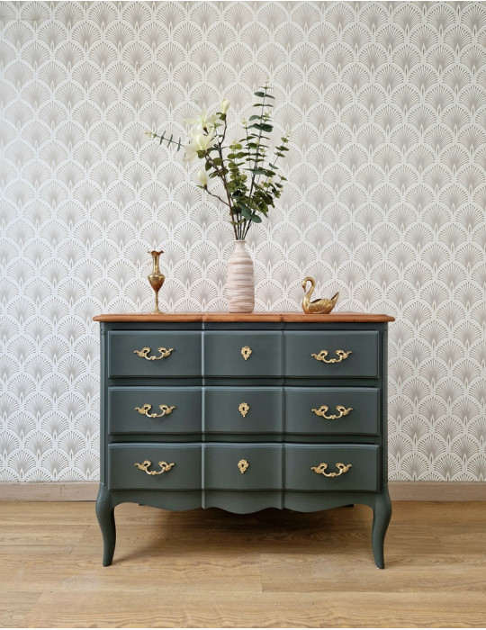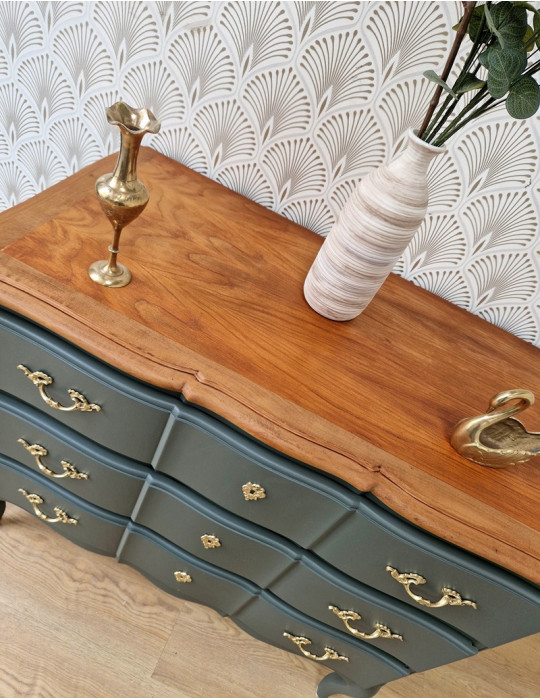 Une belle commode galbée de couleur verte avec un plateau en bois. Une sublime couleur qui rajoute beaucoup de charme à ce meuble. Cette commode chic sublimera votre intérieur