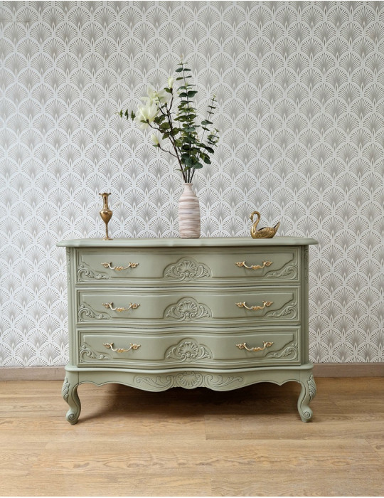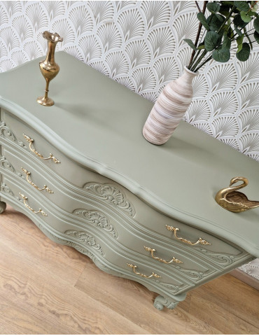 Une sublime commode galbée de couleur verte. Une magnifique couleur qui met en valeur le style du meuble. Cette commode avec beaucoup de charme émerveillera votre intérieur