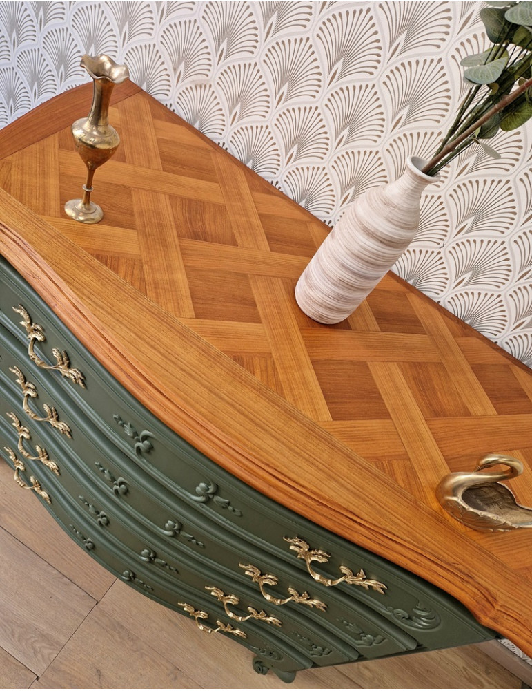 Une sublime commode galbée à 4 tiroirs. Un plateau en bois. Grâce à ses moulures et sa forme, ce meuble incarne l'élégance du style Louis XV