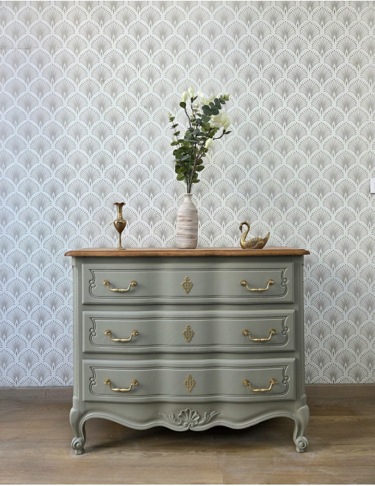 Une magnifique commode galbée de couleur vert sauge. Une sublime couleur qui s'associe parfaitement avec le plateau en bois. Ce meuble apportera beaucoup de charme à votre intérieur