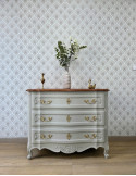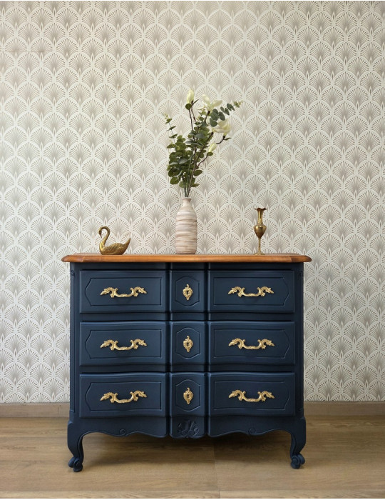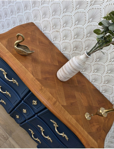 Une belle commode galbée avec un plateau en bois. Une sublime couleur bleue qui s'associe à merveille avec les poignées dorées. Un meuble très chic et élégant qui s'intègre facilement dans votre intérieur