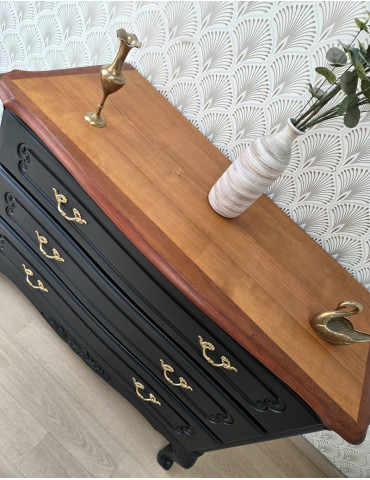 Une belle commode légèrement galbée avec des fines moulures. Une sublime couleur noire avec un plateau en bois vernis. Un meuble chic et élégant qui sublimera votre intérieur