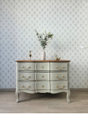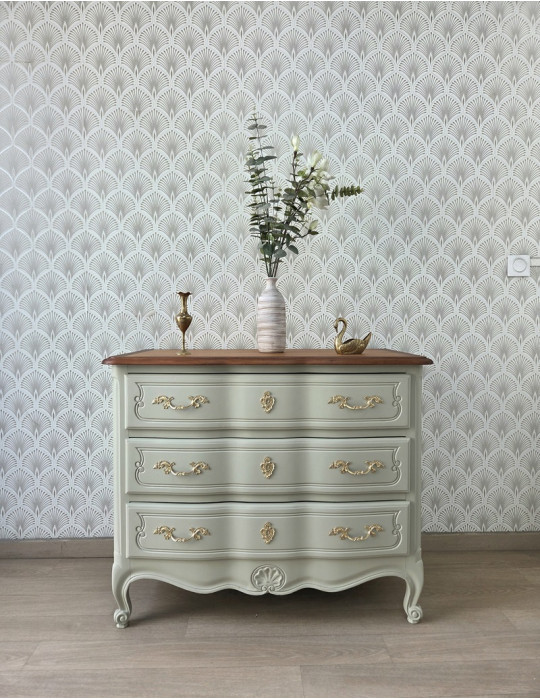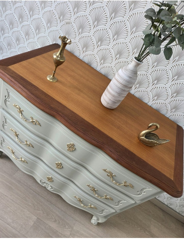 Une belle commode galbée avec un plateau en bois vernis. Une sublime couleur verte très neutre avec des légères nuances grises. Un meuble plein de caractère avec une grande élégance qui sublimera votre intérieur