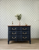 Une sublime commode de style Louis XVI. De couleur noire avec un plateau en bois vernis. Des poignées et des baguettes en laiton viennent contournées les 5 tiroirs. Beaucoup de charme pour ce meuble chic qui sublimera votre intérieur