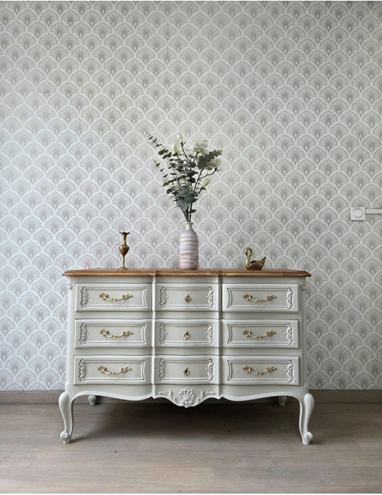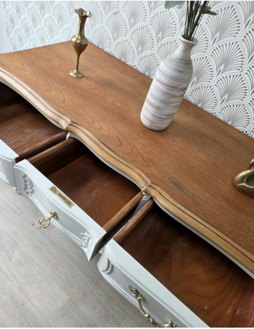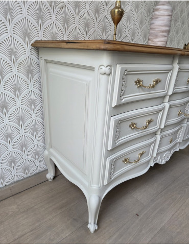 Une sublime commode style louis XV. Une belle couleur blanc cassé avec un plateau en bois vernis. La façade avant ouvrant par 5 tiroirs (3 tiroirs sur la 1ère rangé et 2 grands tiroirs sur la 2ème et la 3ème rangé. Ce meuble unique est d'une grande élégance, il sublimera votre intérieur avec beaucoup de charme