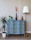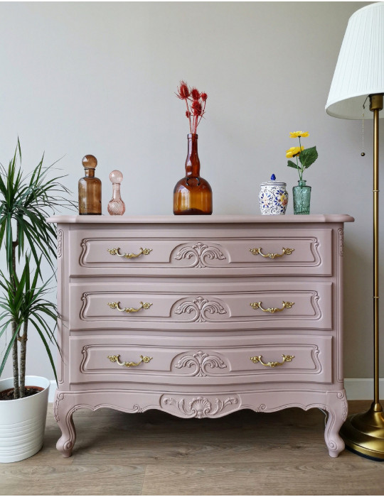 Une belle commode style vintage. Cette commode changera votre intérieur grâce à sa couleur rose fanée et ses poignées dorées.