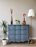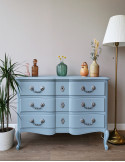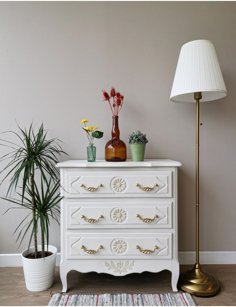 Une belle commode vintage de couleur douce et élégante avec une légère nuance crème. Les moulures étaient ressorties pour que le meuble ne soit pas plat. Des très belles poignées dorées