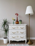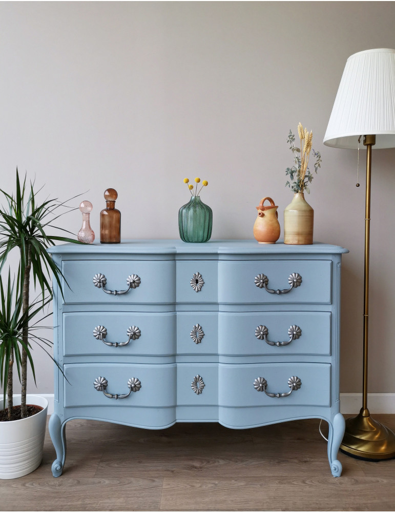 Une belle commode galbée de couleur bleu. Un ton inspiré de la couleur des bords des rivières de la ville de PAISLEY en Ecosse. Des Poignées en argent quartz pour plus de cash
