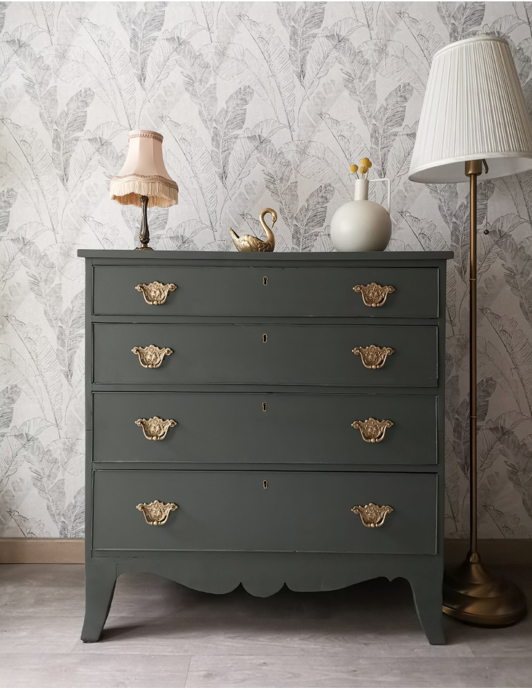 Une belle commode anglaise. De couleur vert sapin, c'est une couleur riche et complexe. Un vert légèrement brillant qui change en fonction de la luminosité. Des belles poignées d'origine dorées.