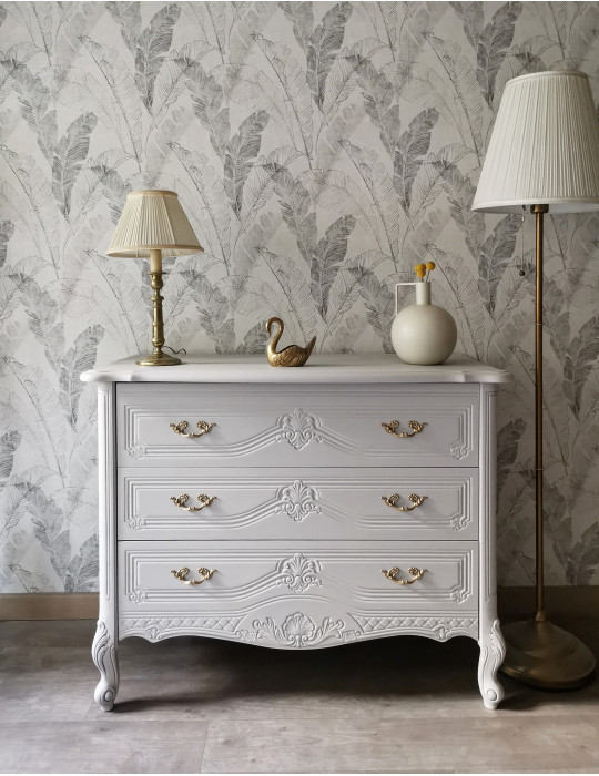 Une belle commode vintage de couleur blanche avec des petites nuances grises. Des poignées dorées. Un style chic et élégant