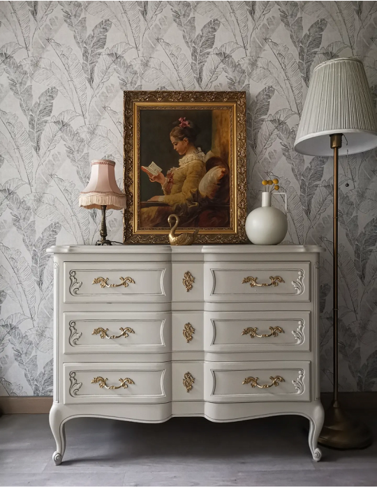 Une belle commode modèle galbée. Un style vintage chic et élégant. De couleur blanc crème avec une légère nuance sablée. Des poignées dorées qui s'associent à merveille avec cette belle robe. Vous pouvez facilement l'introduire dans votre intérieur.