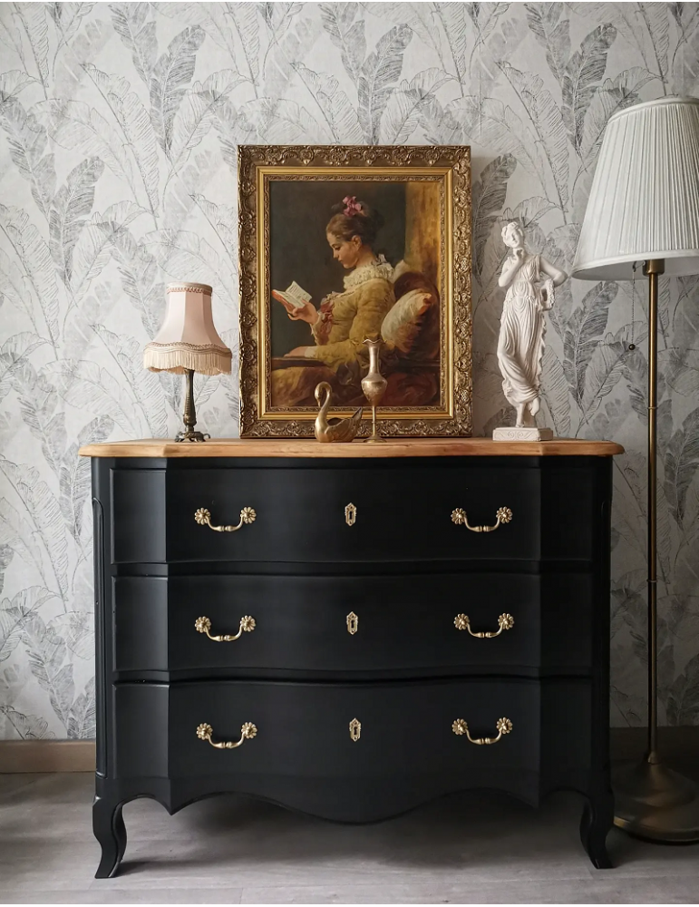 Une belle commode avec un style galbée. Cette commode a été totalement transformée. De couleur noir profond et chic. Un plateau poncé, vernis et laissé à sa teinte de bois d'origine. C'est une pièce qui passera partout dans votre intérieur