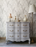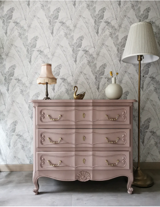 Une belle commode de couleur rose fanée et des poignées dorées. Un modèle galbée et un style chic. Grâce à sa belle couleur gaie, le printemps vous accompagnera toute l'année