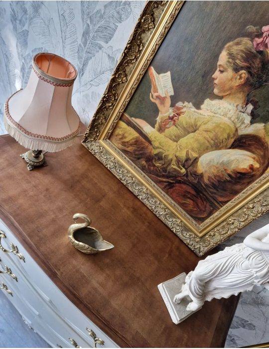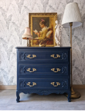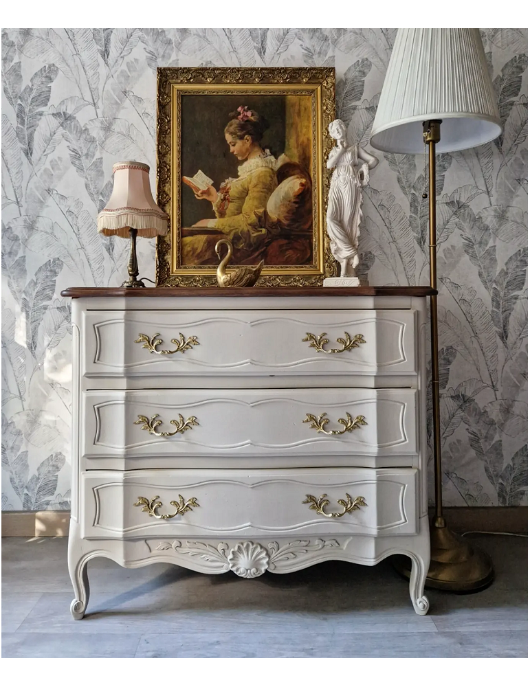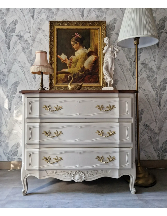 Une belle commode style vintage avec un plateau en bois brut. Le meuble est de couleur taupe claire avec légère nuance rosée. Elle s'associe à merveille avec les poignées dorées. Un meuble unique avec beaucoup de style