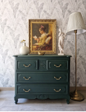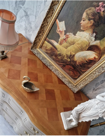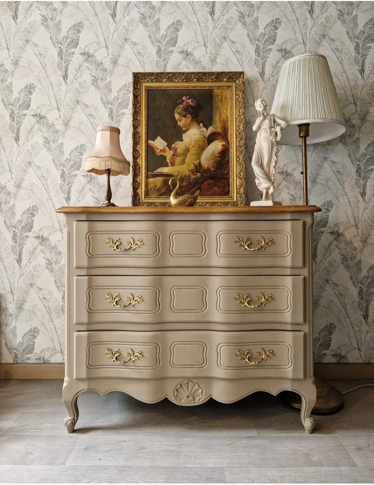Une belle commode vintage style galbé. De couleur beige crème avec des petites nuances dorées. Une sublime couleur qui s'associe avec les poignées dorées Un très beau plateau en bois avec des motifs de parquet de Versailles. Il a été vernis avec une teinte légèrement dorées